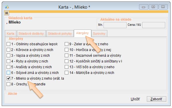 1. Na skladových kartách mať vyplnené alergény - v zozname skladových kariet, je potrebné na skladovej karte v záložke Alergény nastaviť, o aký alergén sa jedná.