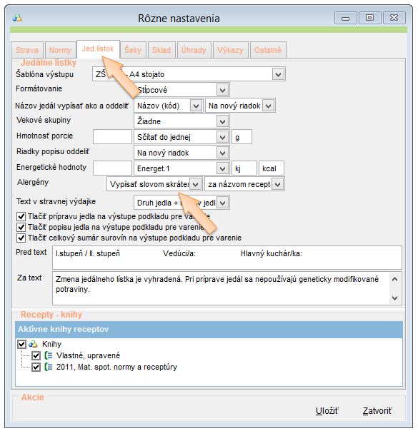 2. Spôsob vypisovania alergénov na jedálnom lístku - v nastaveniach aplikácie, v časti Rôzne, záložka Jedálny lístok je možné nadefinovať, akým spôsobom sa na jedálnom lístku budú alergény vypisovať.