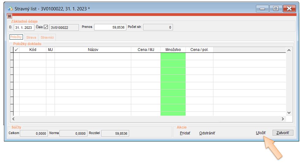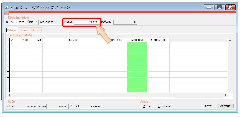 - Vytvoriť počiatočný stravný list ku koncu predchádzajúceho mesiaca od ktorého pokračujete v evidencii, kde sa nahodí zostatok.