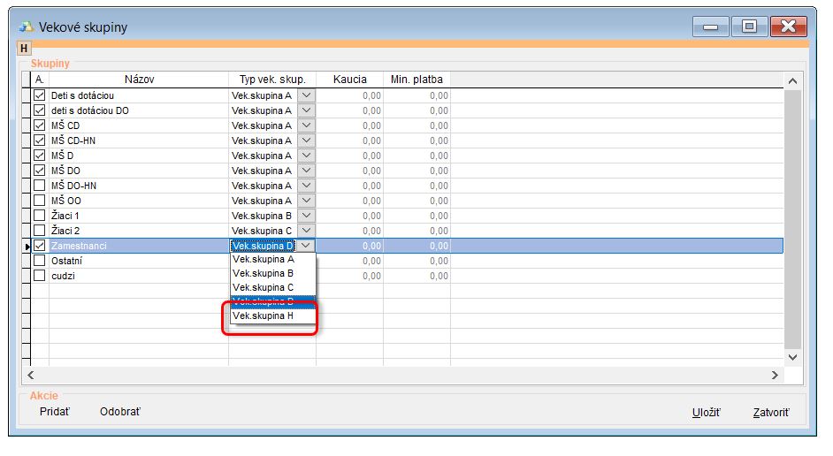 - Upraviť Vekovú skupinu pre dospelých stravníkov. (Nastavenia - Vekové skupiny - nastavenie vek. skupiny H pre dospelých a cudzích stravníkov.)