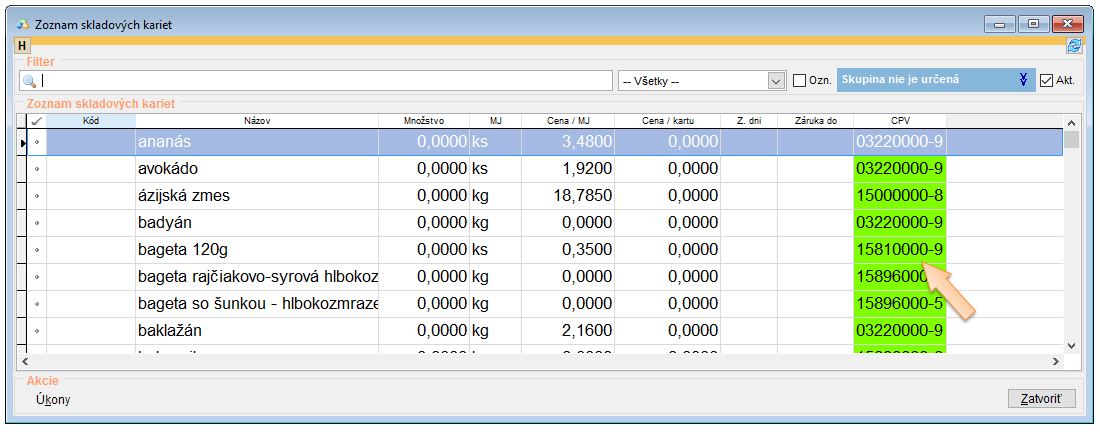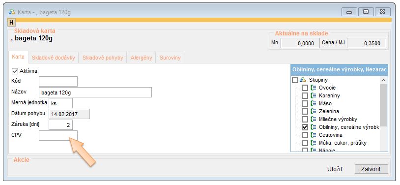 - Nájdite si v zozname skladových kariet kartu, ktorá nemá zadaný kód v stĺpci CPV a danú kartu si otvorte na úpravu.
