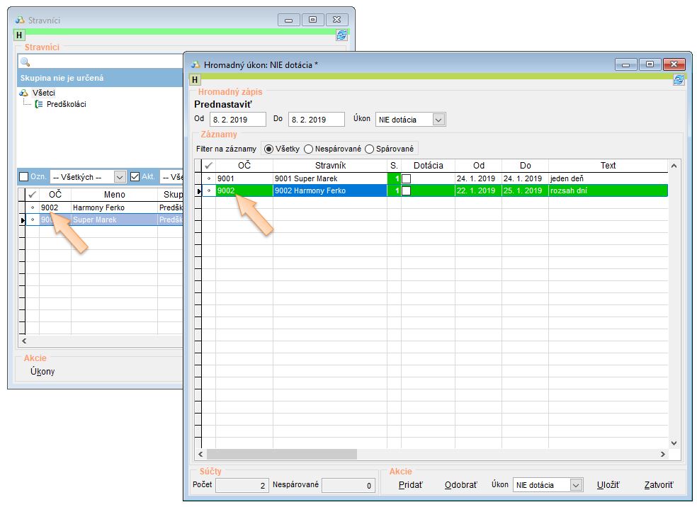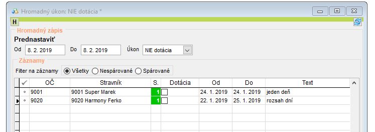 - Pri následnom importe a nastavení NIE dotácia je vybraným stravníkom zrušený nárok na dotáciu.