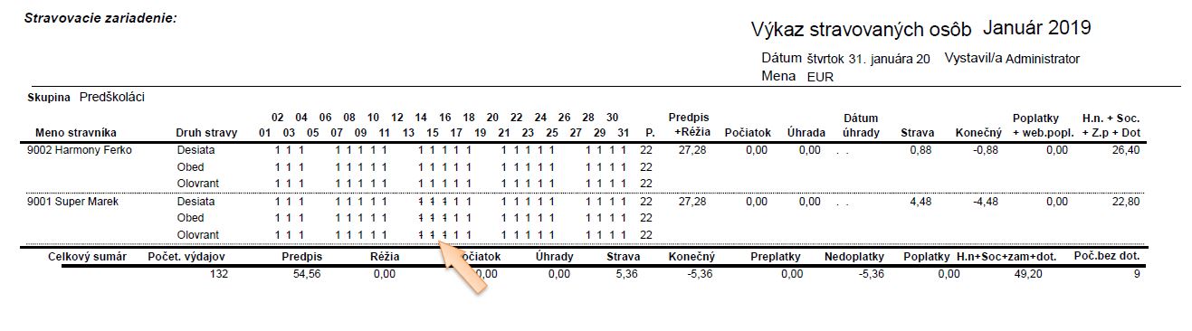 - Dni, na ktoré bol stravník prihlásený ale nemá nárok na dotáciu sú na výkaze prečiarknuté.