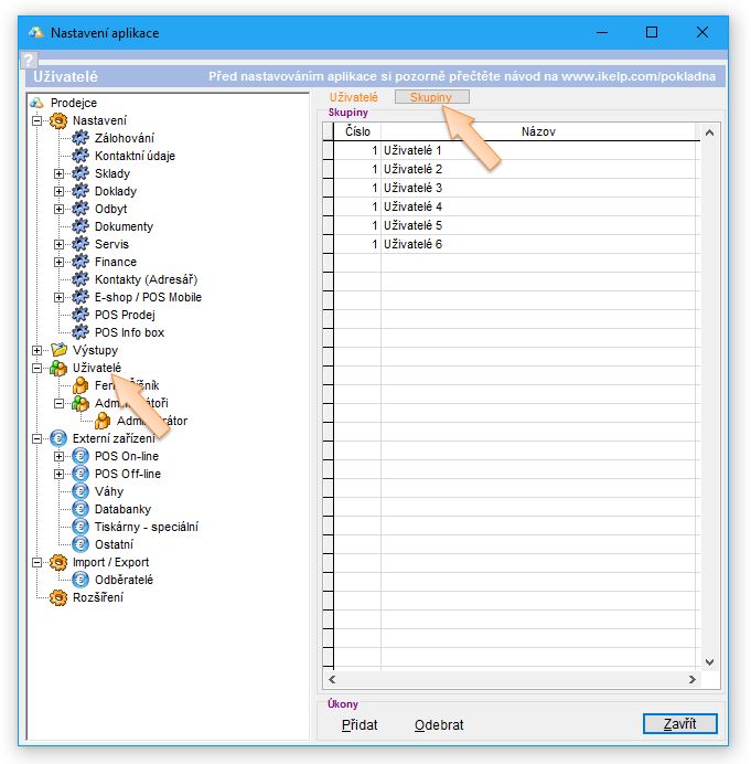 - V záložce Skupiny klikněte na tlačítko Přidat, nebo použijte předvytvořenou skupinu. (Předvytvořenou skupinu je možné i přejmenovat, aby bylo možné ji lépe identifikovat. Např. v restauraci mohou být skupiny pojmenovány "Číšníci" a "Manažeři".)