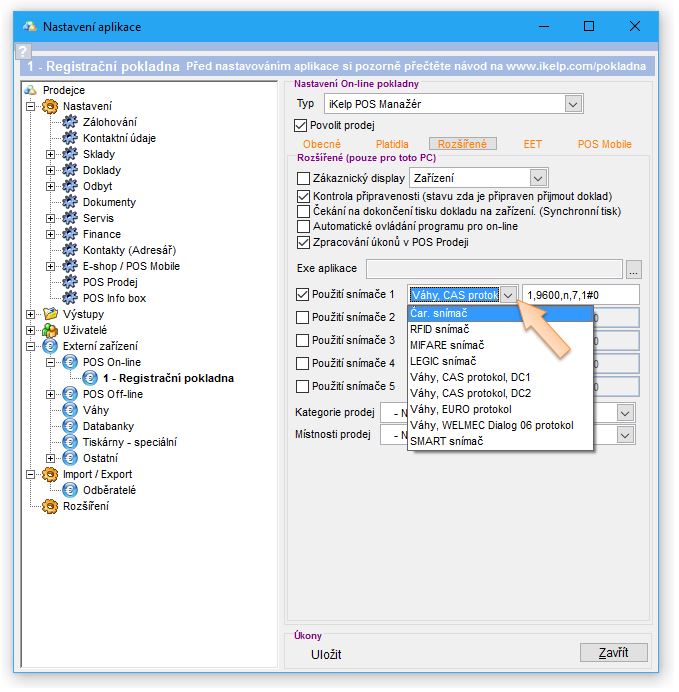- V levé části okna, ve stromu jednotlivých nastavení vyberte možnost Externí zařízení -> POS Online -> Registrační pokladna.