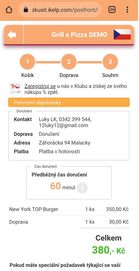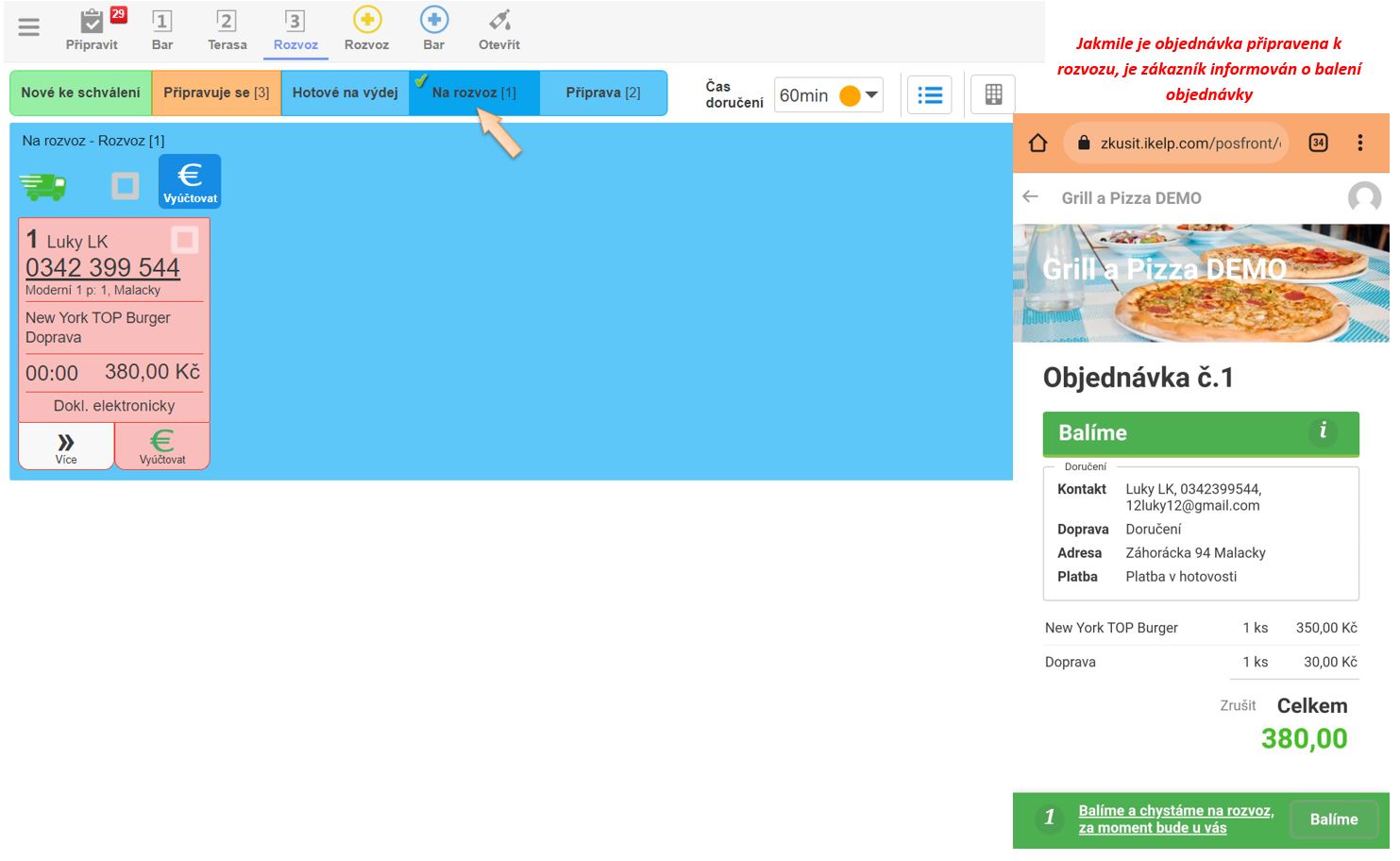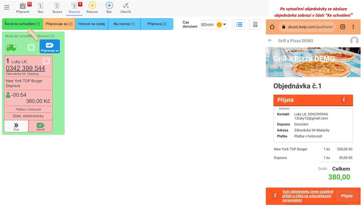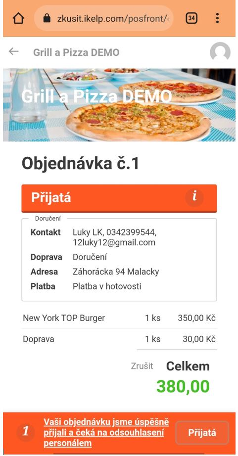 - Zákazník vytvoří online objednávku a vidí stav Přijatá, Čeká se na obsloužení personálem. (Pro svou oblast doručení vidí např. 45min.)