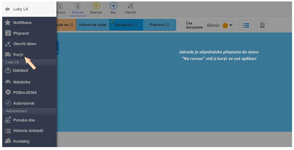 - Rozvozce / poslíček poté převezme objednávky na rozvoz, a spuštěním rozvozu se jejich stav změní pro zákazníka na Doručuje se.