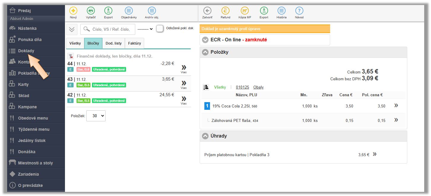 - Kliknite v menu aplikácie na Pokladňa úkony.