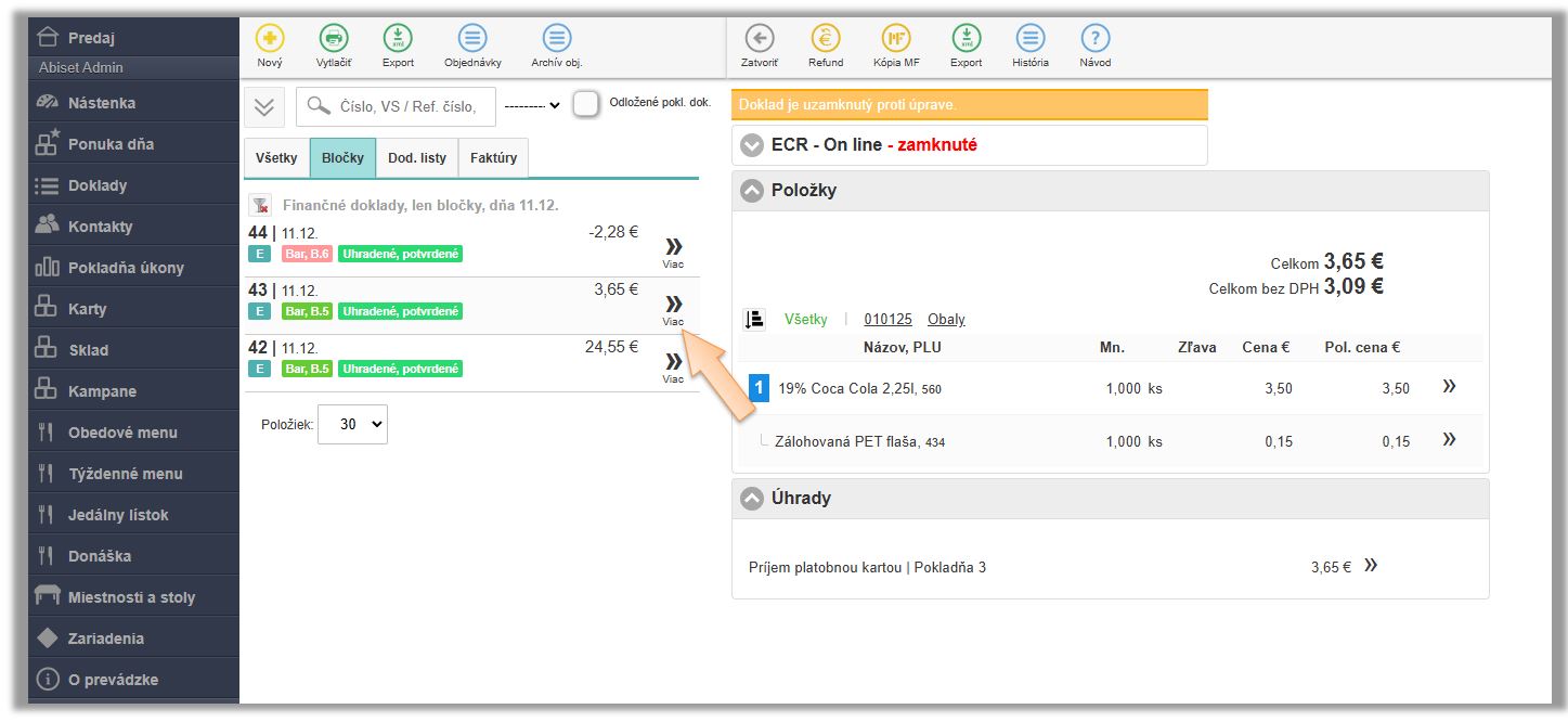 - Po kliknutí na Viac pri jednotlivých položkách sa zobrazí detail položky dokladu, kde je vidieť aj výšku DPH.