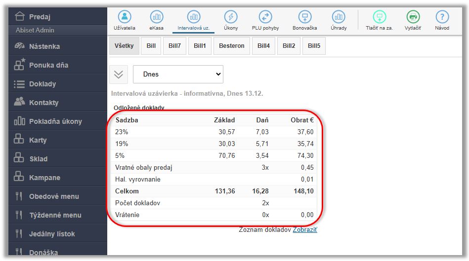 To s akou DPH boli jednotlivé doklady účtované, je možné zobraziť v zozname dokladov, v detaile daného dokladu. Ak potrebujete mať prehľad o tom, v akej sadzbe DPH boli doklady účtované za určité obdobie, je túto informáciu možné zobraziť v časti Pokladňa úkony.