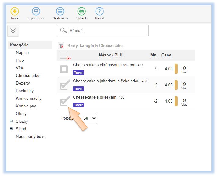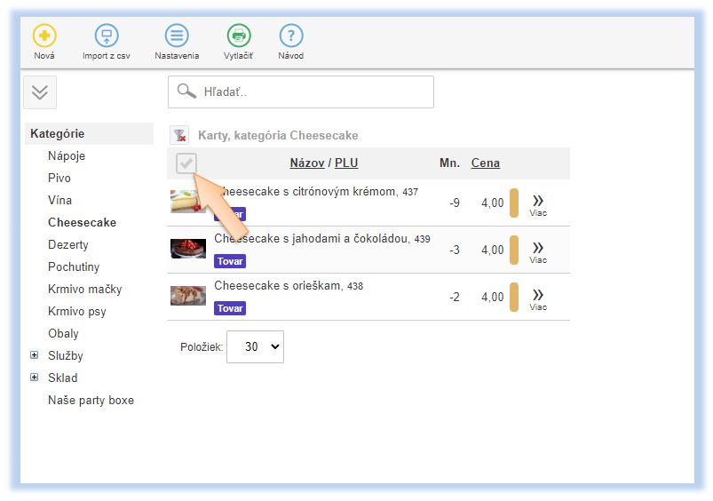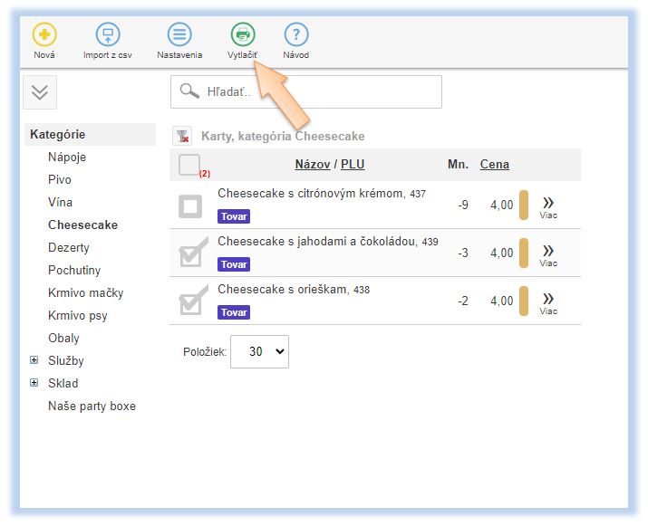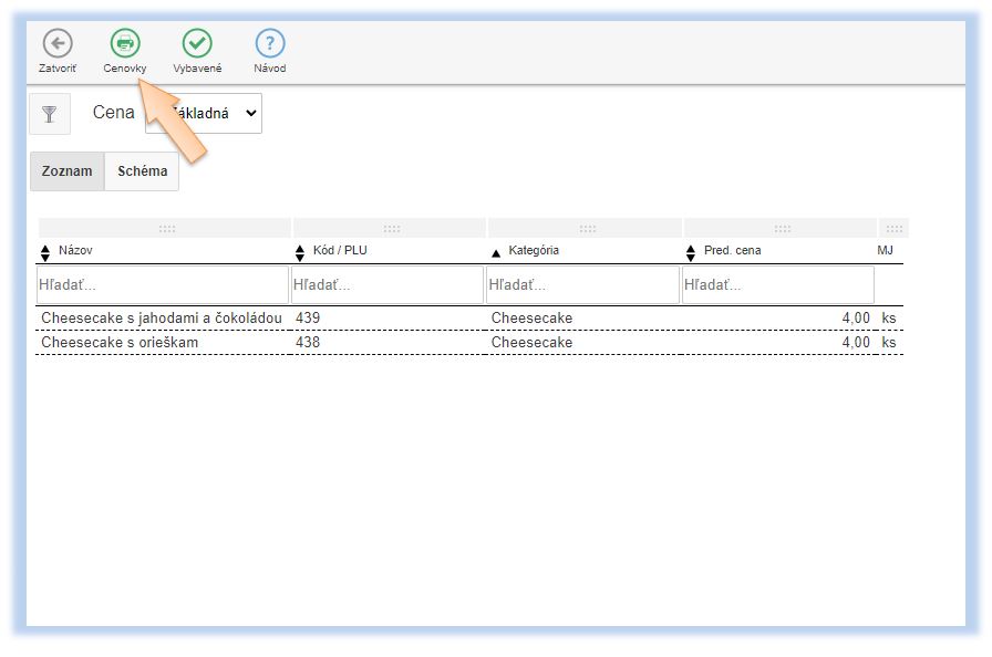 • Pomocou filtra Cena nastavte požadovanú cenu pre tlač Základná/Cenníková/Rozvoz.