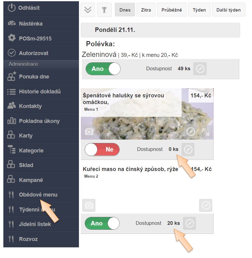 Dostupnost položek menu