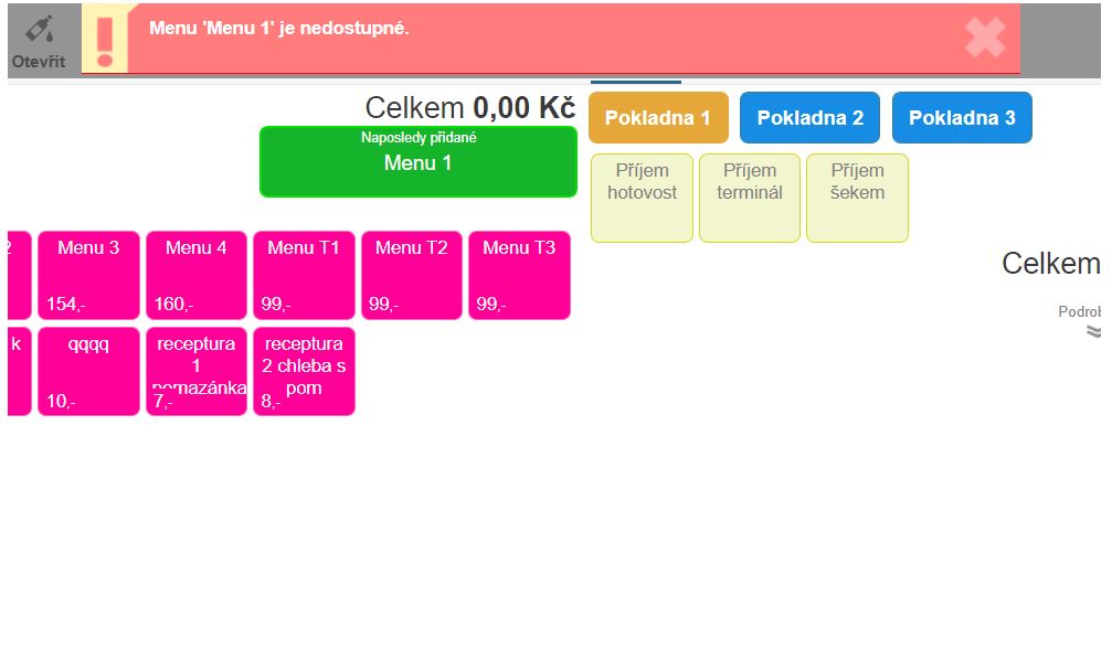 • Pokud se náhle počet daného menu dostane na nulu, tedy se celkově vydá, položka se automaticky nastaví jako nedostupná a není možné ji přidat do objednávky. V případě, že hodnota v menu není vyplněná, systém dostupnost nijak nekontroluje a je tak na obsluze, aby nastavila danou položku při jejím minutí jako nedostupnou manuálně.