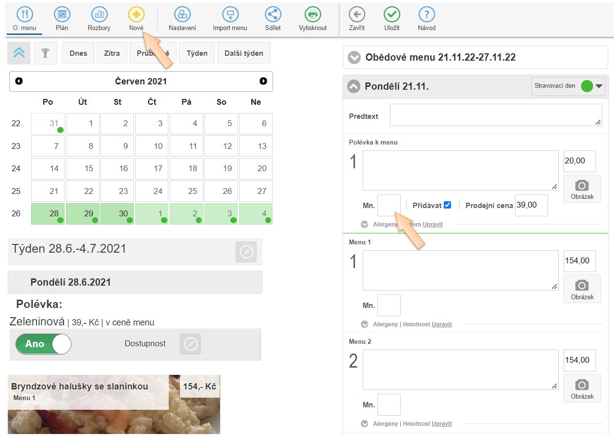 1. Při tvorbě nového menu kliknutím na + Nové a definovaní receptů je možné definovat i dostupné množství jednotlivých jídel v nabídce.