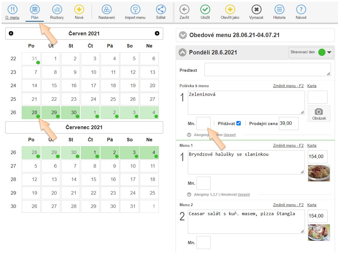 2. Pokud je menu už vytvořené, je možné ho přes Plán otevřít na editaci a množství doplnit.