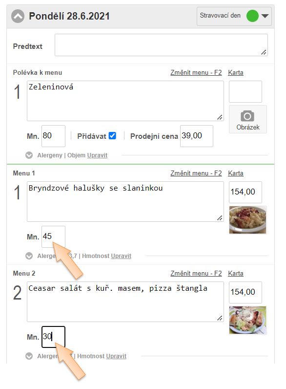 • Uživatel má možnost zadávat dostupné množství přímo při tvorbě, nebo úpravě menu, resp. přímo v denním zobrazení.