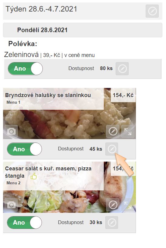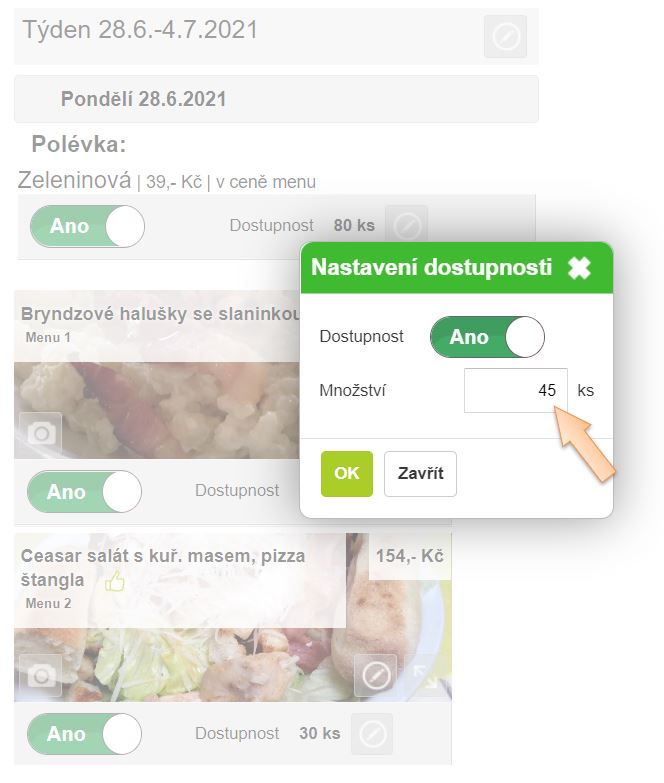 2. V zobrazeném náhledu menu na daný den v časti Dostupnost je možné doplnit nebo upravit dostupné množství.
