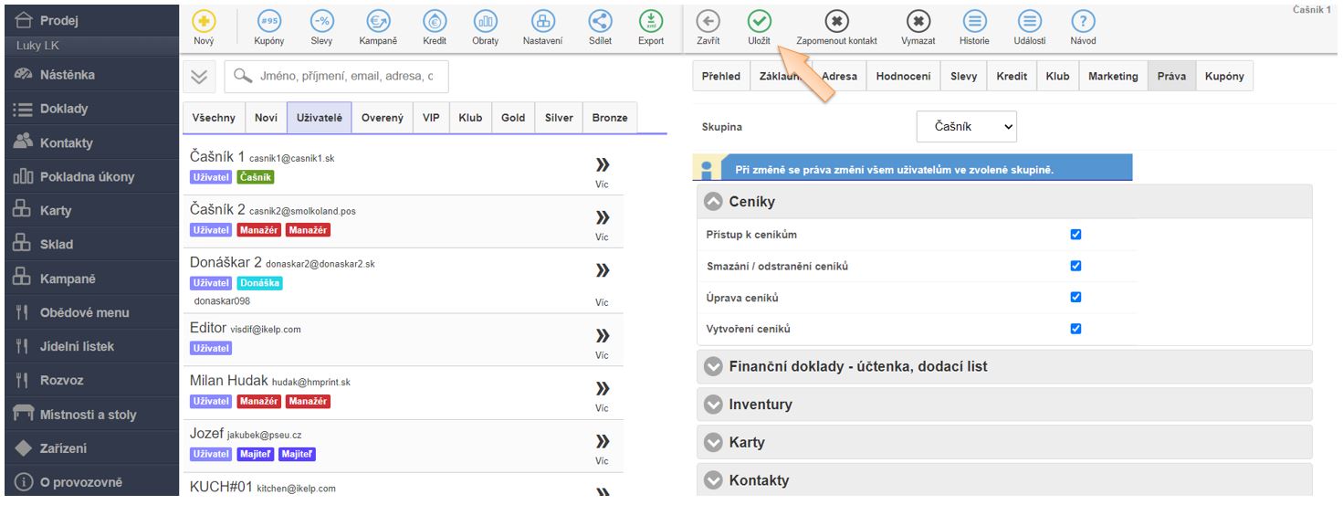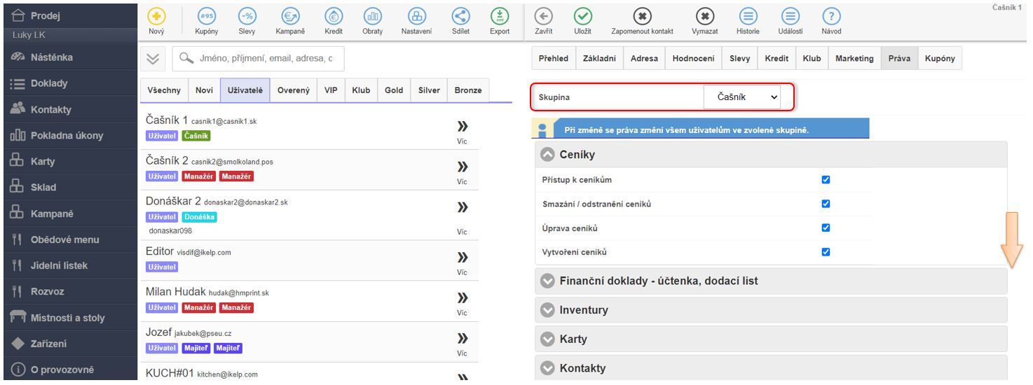 • Pokud je uživatel přiřazen do některé ze skupin, úpravou práv nastavujete práva celé skupině, tedy všem uživatelům v dané skupině.