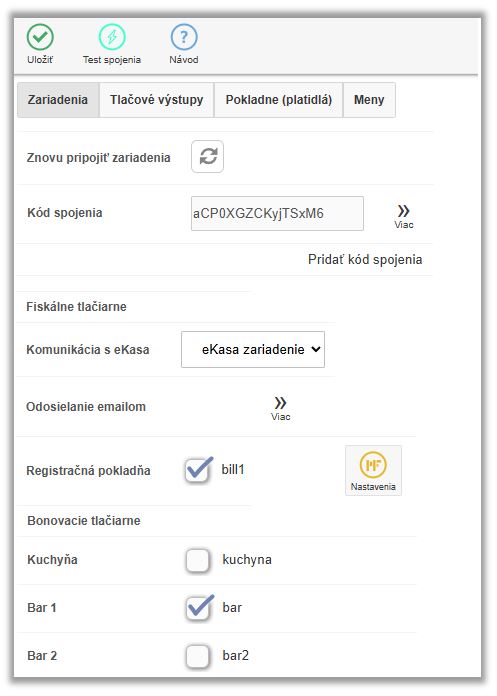Kód spojenia - kód spojenia zabezpečuje spojenie medzi aplikáciou iKelp POS Mobile a aplikáciou POS Manažér. (Ktorá priamo komunikuje s fiskálnym zariadením, prípadne bonovacími tlačiarňami). Túto je potrebné mať nainštalovanú na PC, kde máte fyzicky pripojené a nakonfigurované jednotlivé zariadenia ktoré bude systém využívať. Postup inštalácie a konfigurácie aplikácie pre komunikácie zo zariadeniami nájdete v návode Inštalácia aplikácie POS Manažér a Konfigurácia registračnej pokladne / fiskálnej tlačiarne pre POS Mobile. (V prípade konfigurácie na zariadeniach s OS Android sa kód spojenia nenastavuje. Viac o konfigurácii pripojených zariadení sa dozviete v priloženom odkaze na konci článku.)