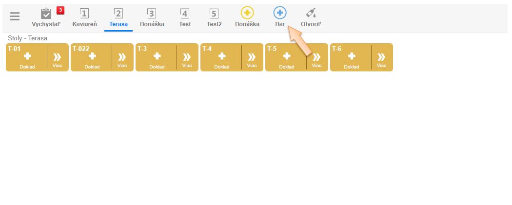 - Kliknite na ikonu +Bar. (+Donáška pri nastavení miestnosti Donáška v režime bar.)