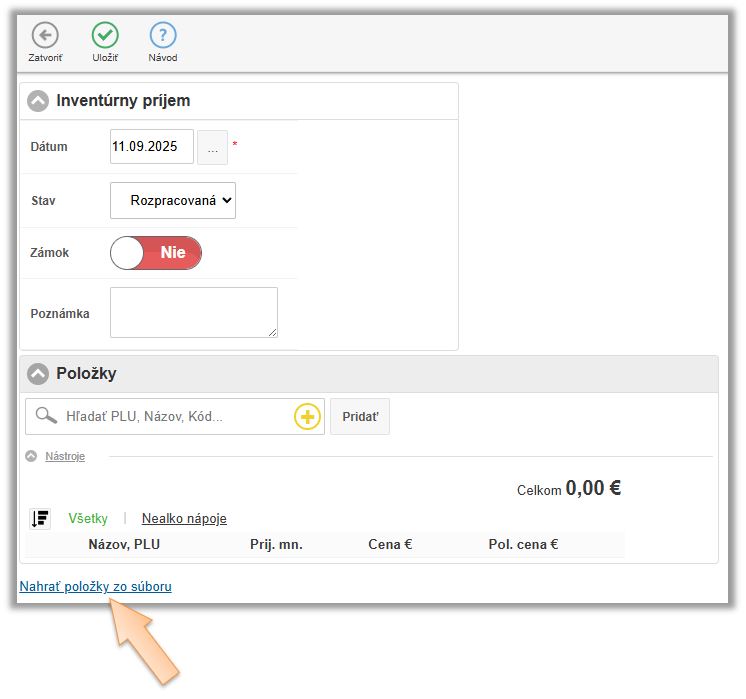 - Celkom - výsledná celková cena položiek v inventúre. (Prijímané množstvo na položke krát jednotková cena.)
