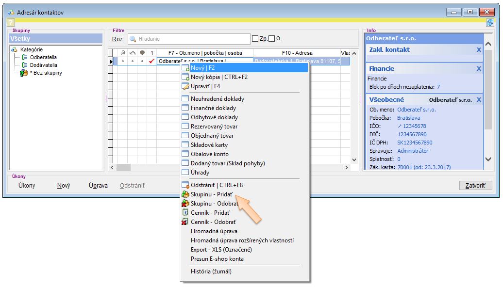 Kontakty v aplikácii je možné jednoducho a prehľadne filtrovať pomocou Skupín kontaktov. Okrem rozdelenia kontaktov na odberateľov a dodávateľov je možné mať vytvorené rôzne podskupiny, napr. pre zákazníkov rozdelených podľa pridelených zliav, prípadne iných vlastností.
