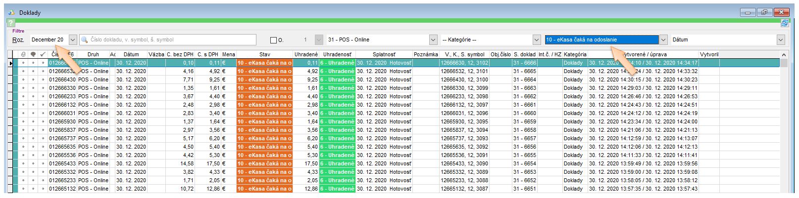 1. Vyfiltrujte doklady so stavom 10 - eKasa čaká na odoslanie a obdobie, v ktorom neboli doklady odoslané.