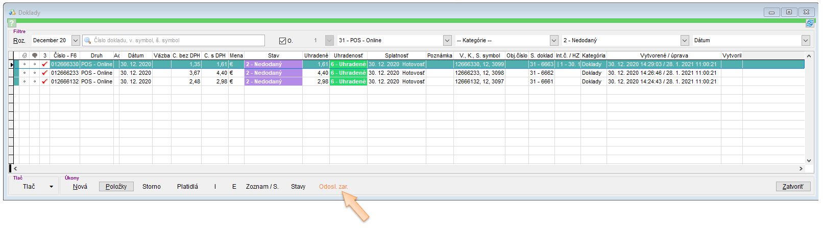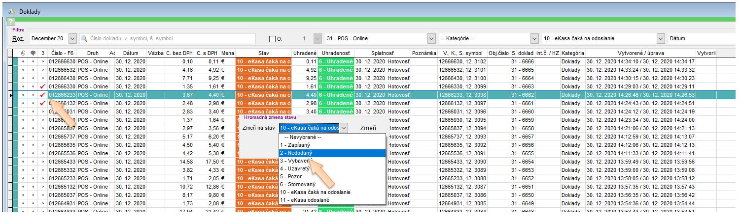 3. Zmente stav dokladov z 10 - eKasa čaká na odoslanie na 2 - Nedodaný.