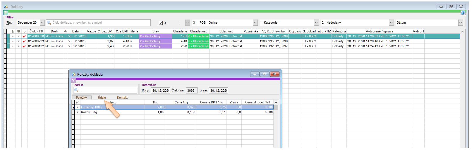 5. Otvorte detail dokladu kliknutím na tlačidlo Položky alebo dvojklikom na doklad.