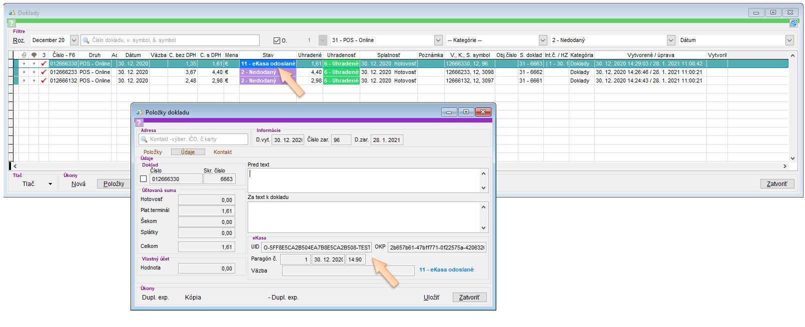 10. Po odoslaní dokladu sa v detaile dokladu doplnia údaje OKP a UID.