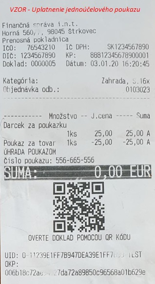 Vzorové doklady o predaji a následnom čerpaní jednoúčelového poukazu s vyobrazením čísla poukazu. (Napr. zariadenie FiskalPro tlačí číslo ako sériové a pod.)