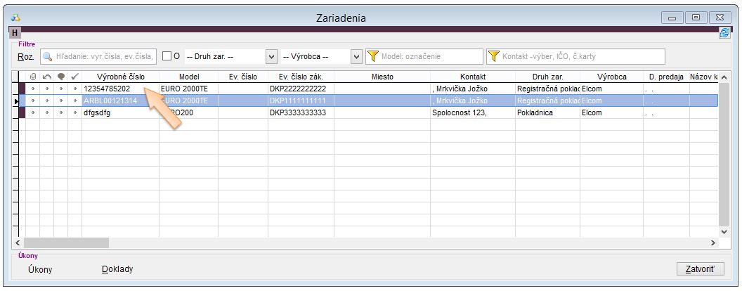 - V stĺpci Zariadeni je následne zobrazený model zariadenia a VČ zariadenia na ktorom bola plomba použitá.