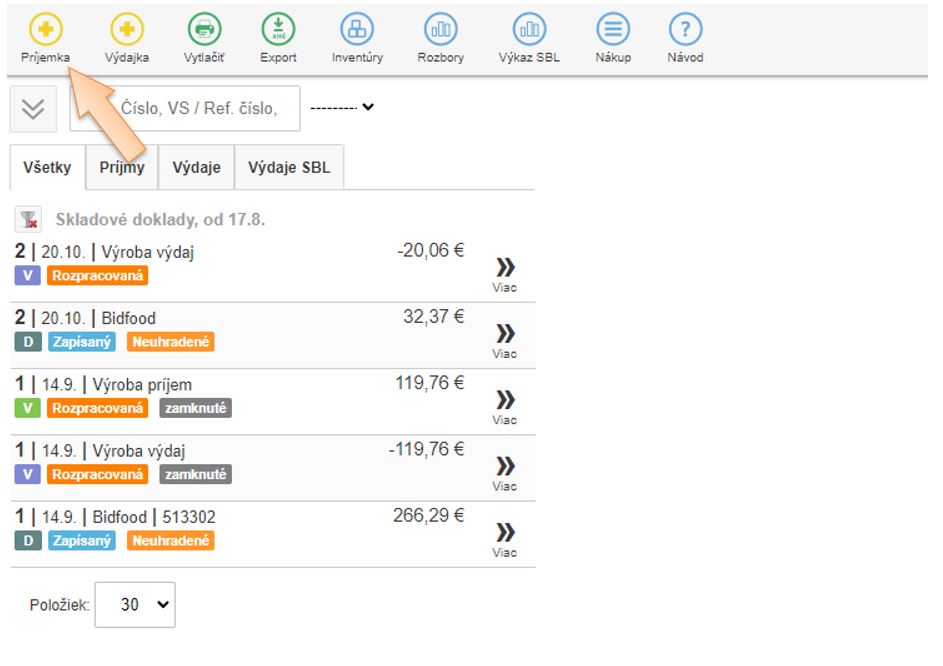 - Kliknutím na + Príjem vytvoríte skladový výdaj.