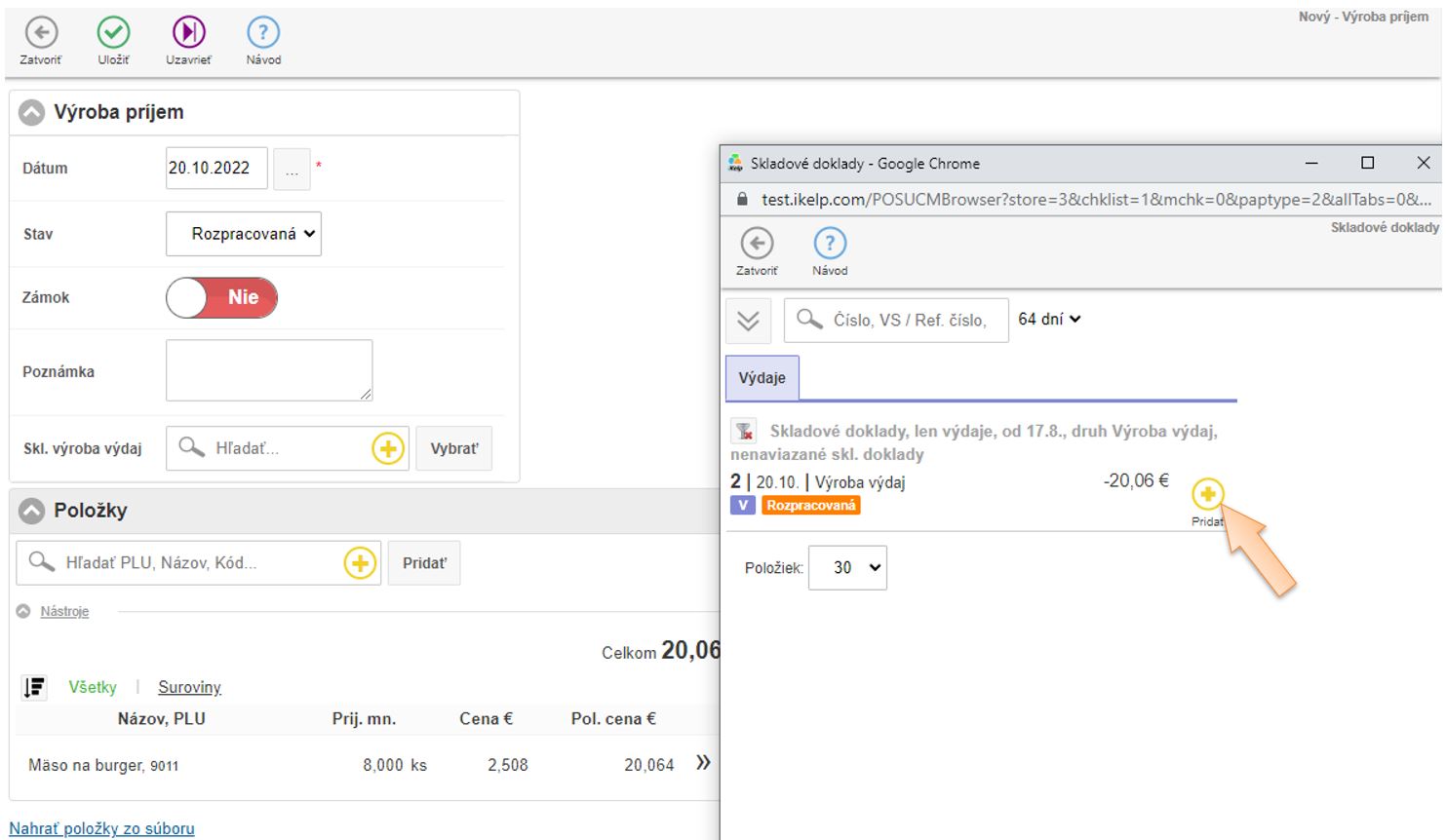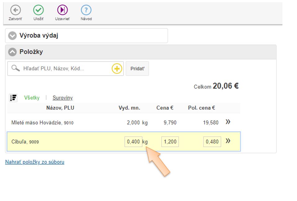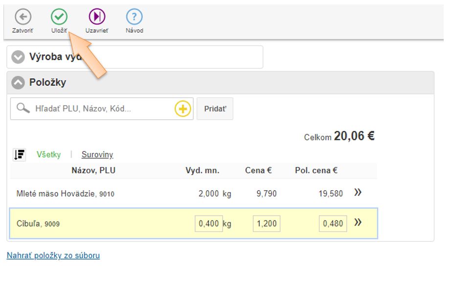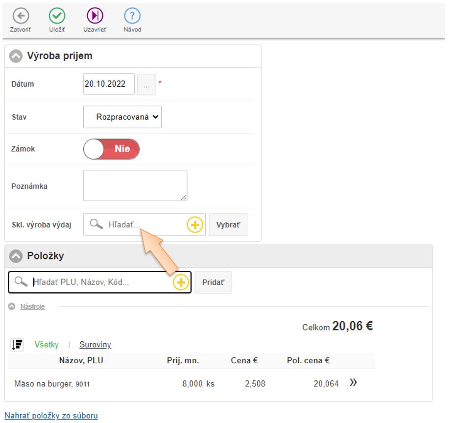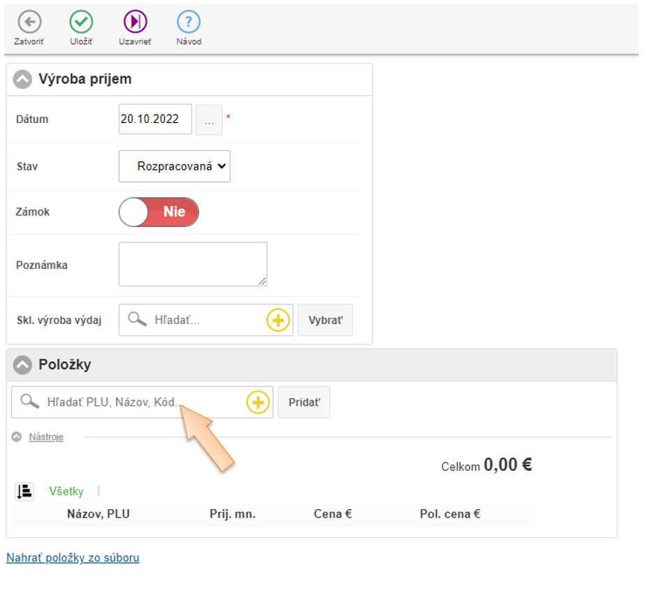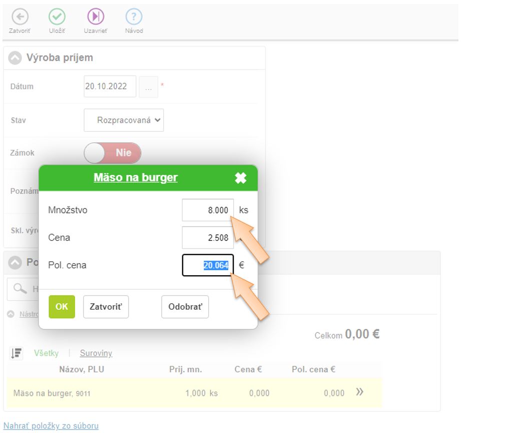 - Vložte položky do dokladu ktoré vznikajú výrobou, zadajte množstvo a skladovú cenu.