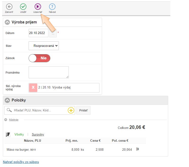 - Doklad môžete Uložiť, alebo Uzavrieť, pri uzavretí sa mení systémový stav doklad a doklad sa automaticky uzamyká proti úprave.