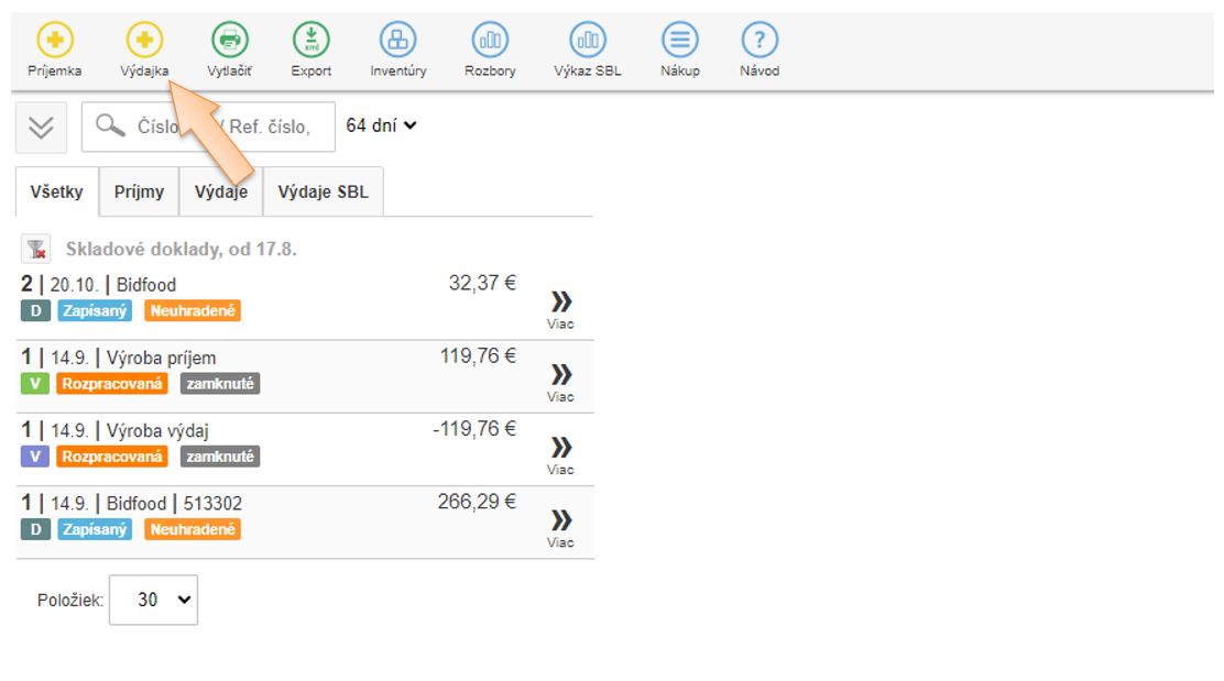 - Kliknutím na + Výdajka vytvoríte skladový výdaj.