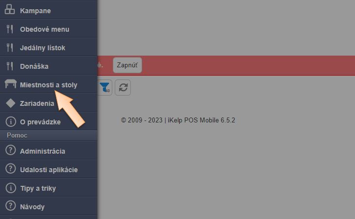 - Kliknite na Miestnosti a stoly v menu aplikácie.