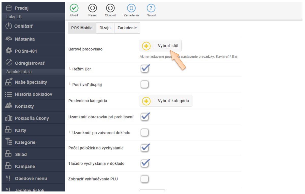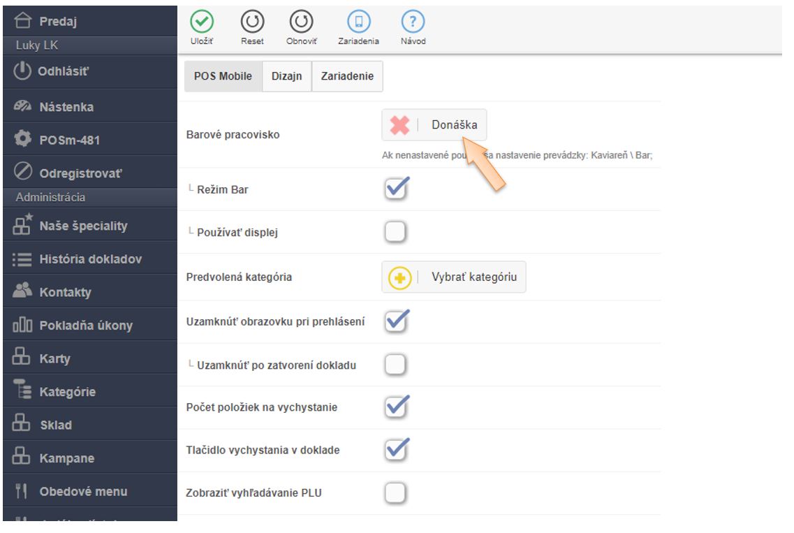 - V časti Barové pracovisko kliknutím na + Vybrať stôl vyberte miestnosť Donáška.