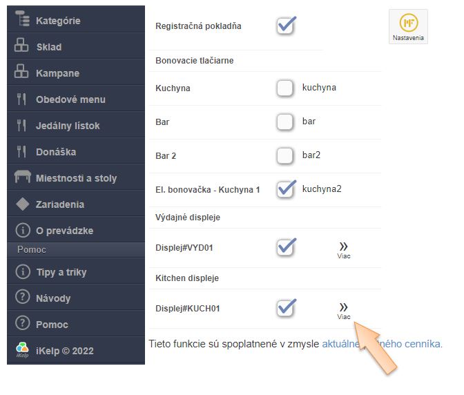 - Bonovačky - výber elektronických bonovacích tlačiarní, ktoré sa budú zobrazovať na displeji. Ak je v kuchyni viacero pracovísk je možné pri elektronickej bonovačke tak ako pri klasickej definovať, kde sa bon po pridaní jedla do objednávky vytlačí resp. zobrazí. Pre aktiváciu elektronických bonovacích tlačiarní kontaktujte pracovníkov technickej podpory na podpora(at)ikelp.com.