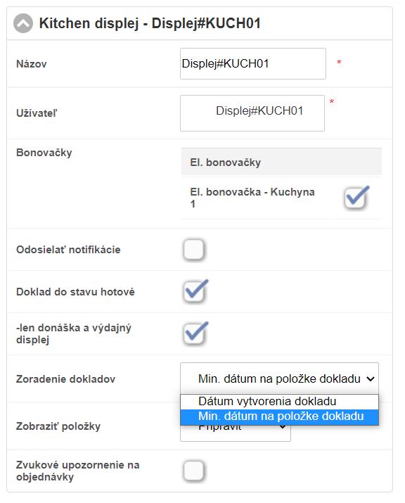- Min. dátum na položke dokladu - položky sa na displeji zobrazujú v poradí podľa toho, ako sú pridávané do dokladov / objednávok. (Tento scenár je vhodný pri reštauračných prevádzkach, kde si hostia postupne doobjednávajú a objednávky sú vybavované priebežne.)
