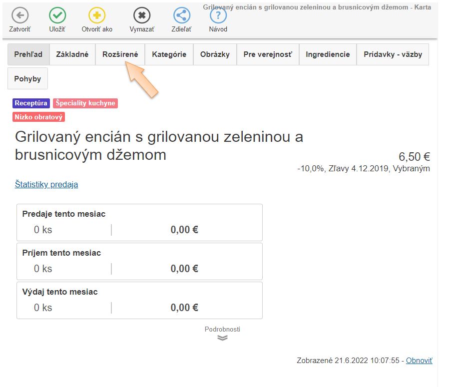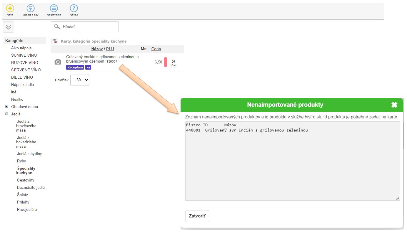 - Bistro príloha ID je naviazaná položka, ktorú importujeme kliknutím na "Importovať naviazané položky" napr. ananás, baranie rohy, cibuľa, plastový príbor a pod.