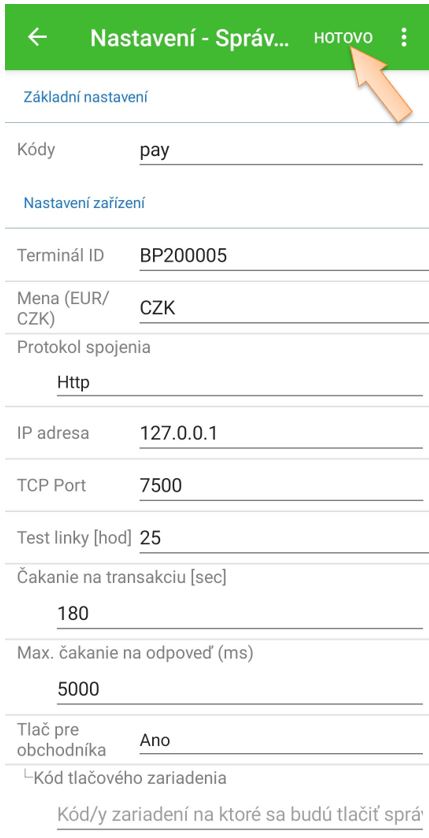 - Zadajte v častii Kódy názov (kód) zariadenia. (Kód zariadenia musí byť zhodný s kódom zariadenia z POS Mobile. Odporúčame ponechať kód pay, ak už tento nie je použitý na inom zariadení.)