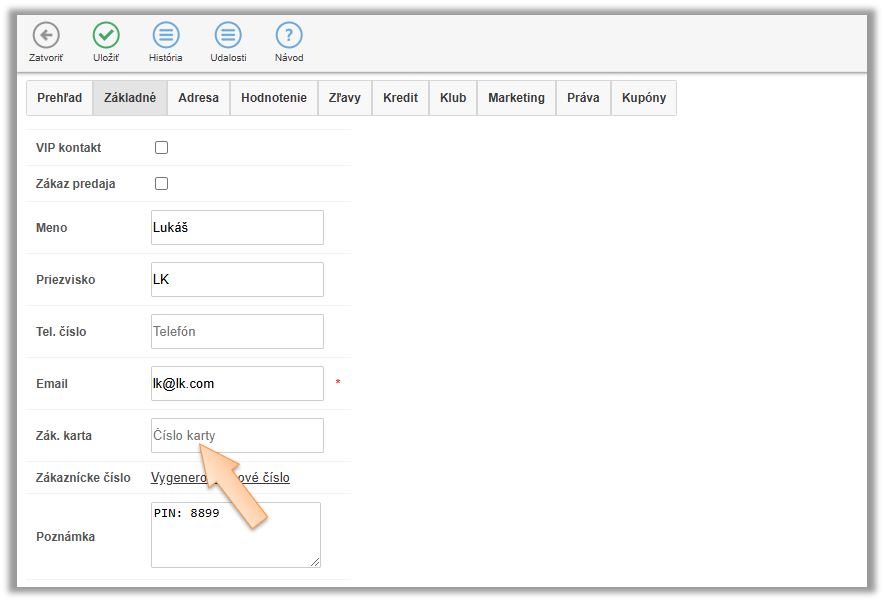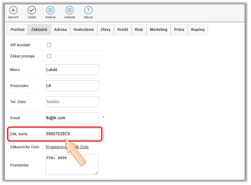- V záložke Základné kliknite do poľa Zák. karta a priložte kartu k čítačke. (Zobrazí sa identifikátor priloženej karty.)