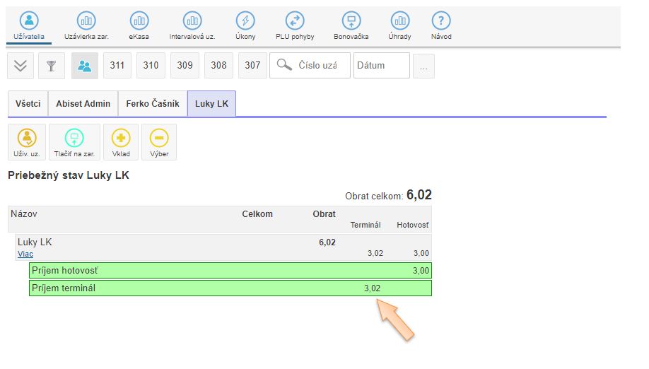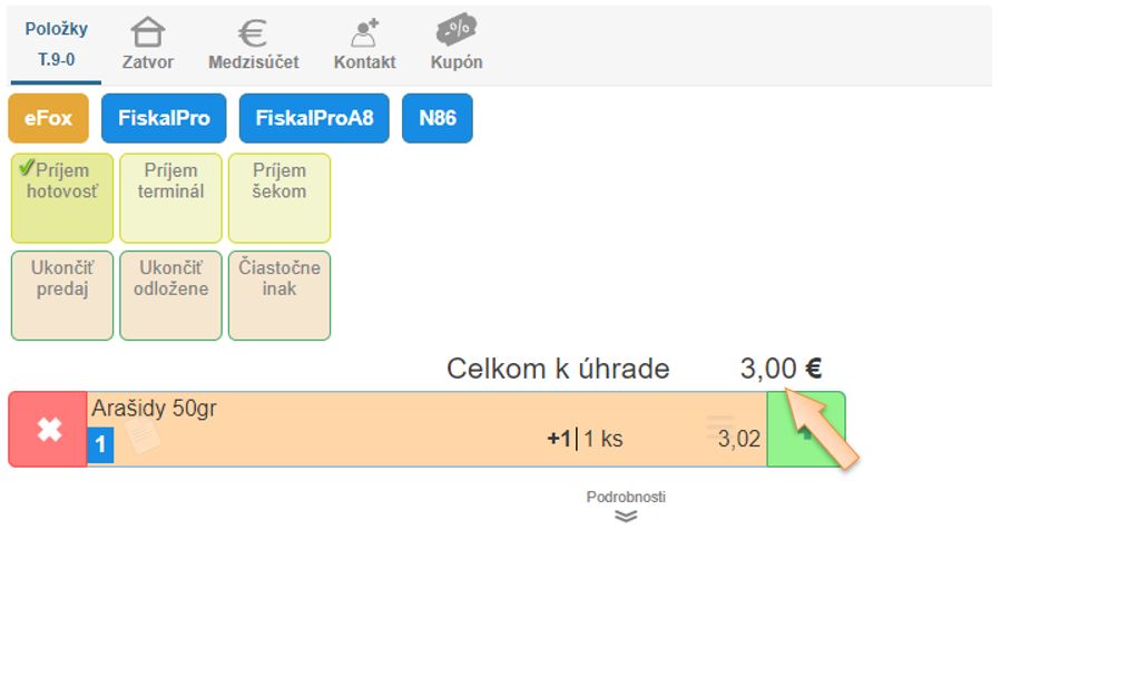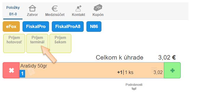 Opäť na vzorovom príklade rovnaká položka v sume 3,02€, pričom pri ukončovaní dokladu a výbere platidla Terminál už celková cena nie je zaokrúhlená. Tak isto ako v prvom príklade sa prijatá suma započíta do Nástenky aj záznamov pokladne v takej výške, ako bola prijatá od zákazníka.
