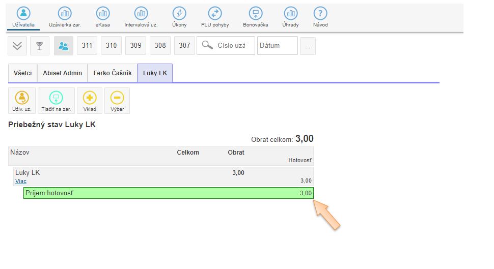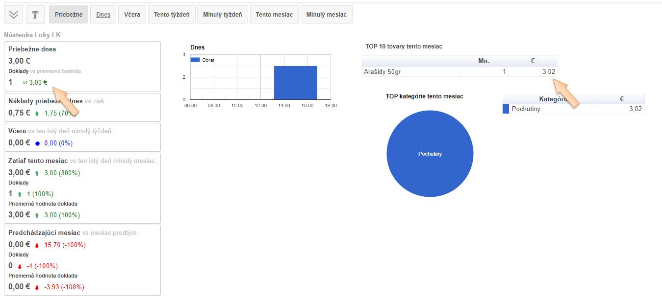 Na vzorovom príklade je jedna položka v sume 3,02€ ukončená platbou v Hotovosti, kde je vidieť, ako je suma zaokrúhlená ako aj to, ako sa následne toto zaokrúhľenie prejaví na Nástenke a v záznamoch pokladne. V záznamoch pokladne aj v tržbe je započítaná suma, ktorú obsluha prijala od zákazníka samozrejme zaokrúhlená, pričom v štatistikách predajov položiek je evidovaná predajná cena nezaokrúhlená.