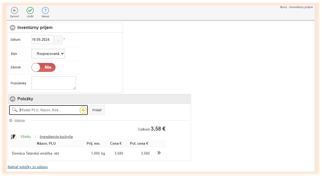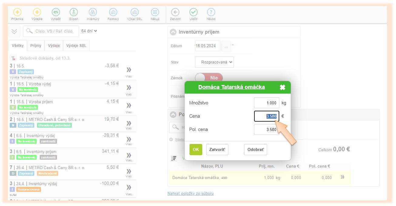 - Do príjemky pridajte kartu "Domáca tatárska omáčka" v množstve 1kg a vyplňte cenu za príjem podľa výdajky.