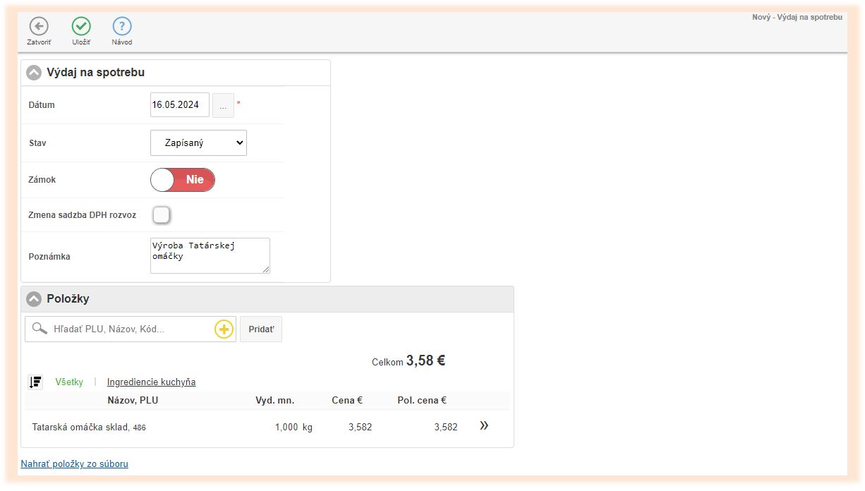 - Do výdajky pridajte kartu "Tatárska omáčka sklad" v množstve 1kg.